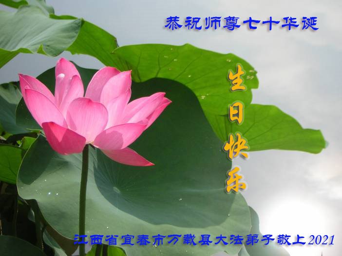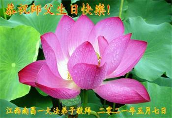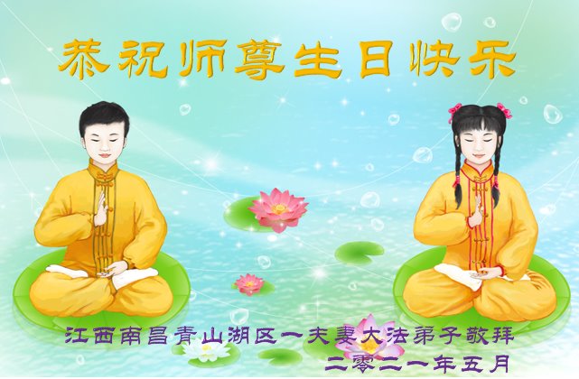 恭贺师尊华诞 风雨二十五年 助师救度众生 多亏师尊保护 弟子才有今天 今日师尊华诞 恭祝师尊万言 江西九江大法弟子恭上 二零二一年五月一日 江西省九江市永修县大法弟子恭贺法轮大法传世二十九周年!