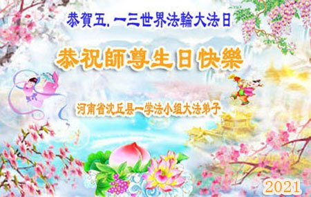 河南省周口市沈丘县一学法小组大法弟子庆祝世界法轮大法日!恭祝师尊生日快乐!