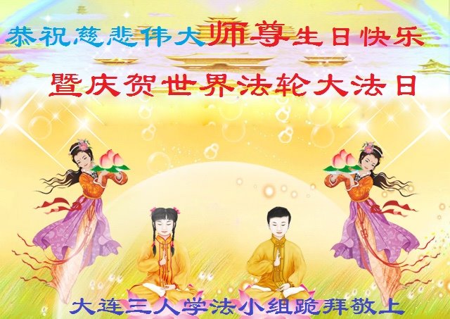 辽宁省大连市三人学法小组大法弟子恭祝慈悲伟大的师尊生日快乐!暨恭贺世界法轮大法日!