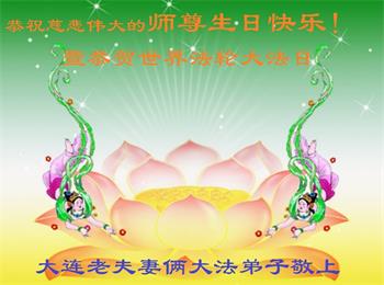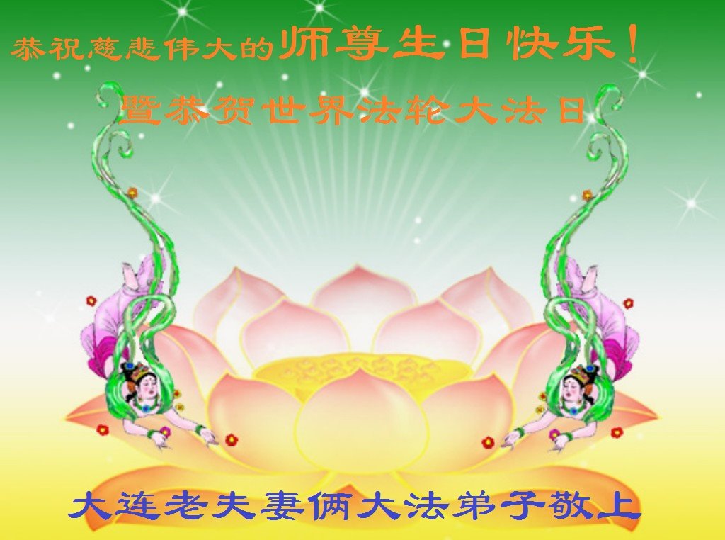 辽宁省大连市老夫妻俩大法弟子恭祝慈悲伟大的师尊生日快乐!暨恭贺世界法轮大法日!
