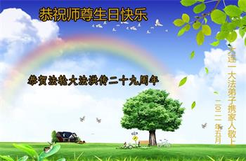 恭祝师尊生日快乐!恭贺法轮大法洪传二十九周年! 感谢师尊传大法度我们,这些年来弟子受益匪浅,今天弟子感谢师尊时时保护,为弟子辛苦操劳,谢谢慈悲伟大的师尊。弟子做的很差,三件事做的不够好。今后要加倍努力做好三件事,修好自己,加快提高心性,跟上正法進程,跟师尊回家! 大连周边大法弟子庆祝513世界法轮大法日 辽宁省大连一家三位大法弟子恭祝师尊生日快乐!恭贺世界法轮大法日!