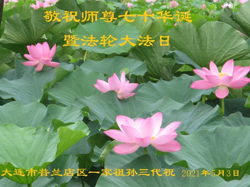 大连市普兰店区一家祖孙三代敬祝师尊七十华诞暨法轮大法日! 祝师父生日快乐! 2021年5月3日 辽宁省大连大法弟子恭祝师尊生日快乐!普天同庆世界法轮大法日!