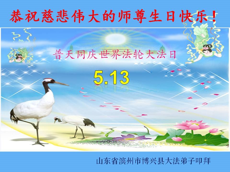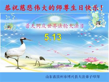 山东省滨州市博兴县大法弟子恭贺世界法轮大法日!恭祝师尊生日快乐!