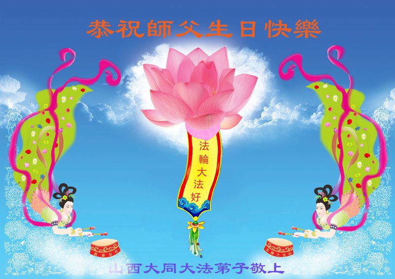 我们夫妻俩二十多年来的修炼在师父的慈悲保护下走到今天,感到太幸运了,感谢师父!恭祝师父生日快乐!谢谢师父! 山西大同夫妻大法弟子敬上 山西大同一大法弟子恭祝慈悲伟大的师尊生日快乐!