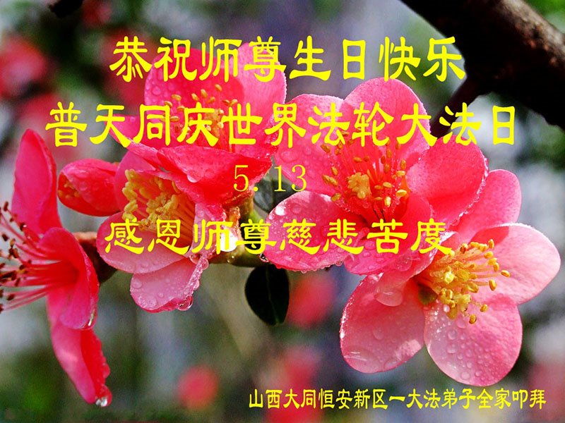 山西省大同市恒安新区一大法弟子全家恭祝师尊生日快乐!恭贺世界法轮大法日!感恩师尊慈悲苦度!