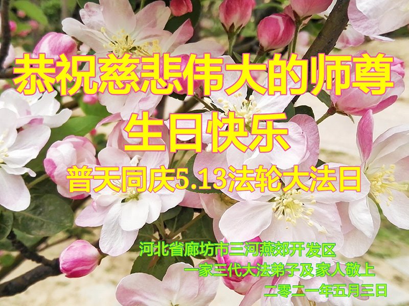 【明慧网二零二一年五月十一日】 河北廊坊市一大法弟子代表十五口亲属恭祝师父生日快乐!
