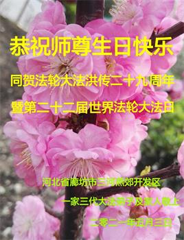 河北省廊坊市三河燕郊开发区一家三代大法弟子及家人恭祝师尊生日快乐!同贺法轮大法洪传二十九周年暨第二十二届世界法轮大法日!