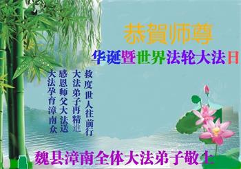 恭祝师尊生日快乐!恭祝世界法轮大法日! 河北省邯郸市魏县漳南全体大法弟子恭贺师尊华诞暨世界法轮大法日!