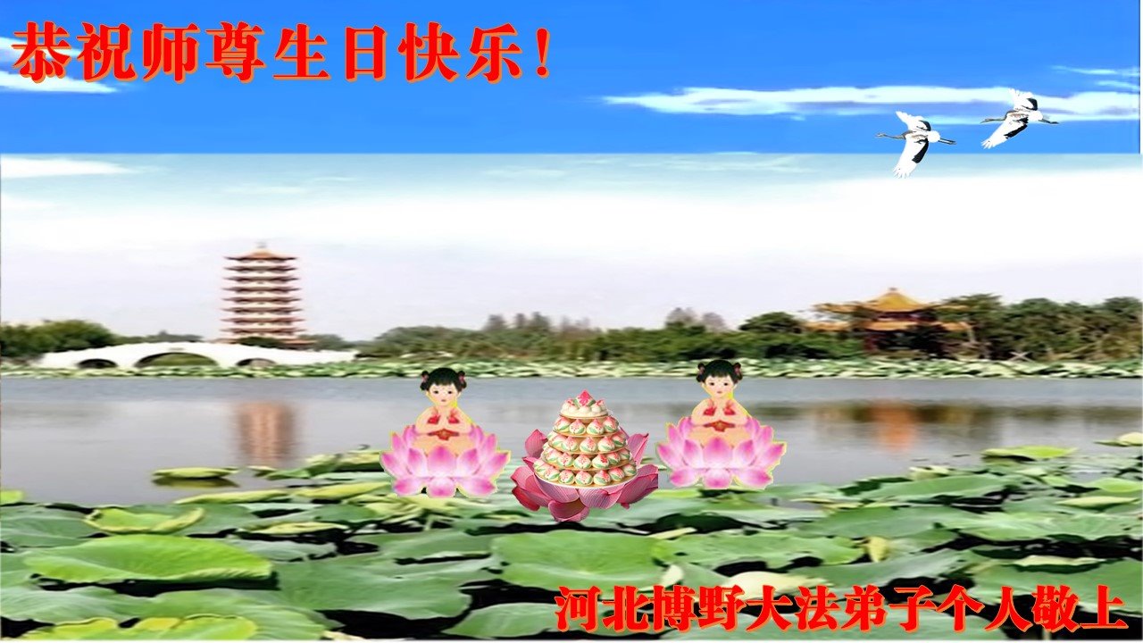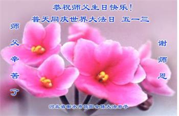 师尊您辛苦了!在正法的最后时期,弟子一定跟上师父的正法進程,更多的救度众生,惟愿师尊笑! 河北正定全体大法弟子恭贺世界法轮大法日!恭祝师父生日快乐!