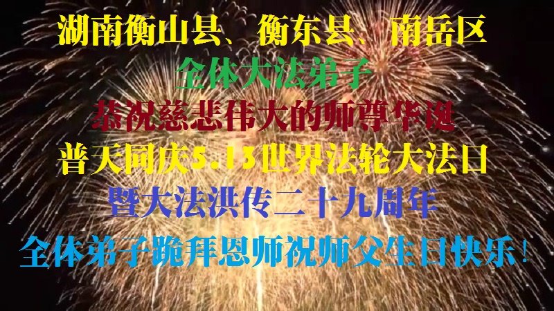 恭祝师父生日快乐! 感谢师父时时保护,愿师父少一份操心,多一份欣慰。弟子们会做好三件事,在法中提高自己。 湖南省衡阳市衡山县、衡东县、南岳区全体大法弟子恭祝慈悲伟大的师尊华诞!