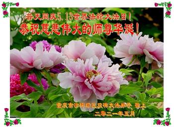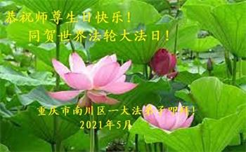 值此二十二届世界法轮大法日,法轮大法洪传29周年,师父七十华诞之日,普天同庆,同祝、同颂、同贺。弟子们齐呼:法轮大法好!真善忍好!师父好!谢谢师父救度! 重庆市沙坪坝区一学法小组 2021年5月5日星期三 重庆市大法弟子恭祝师尊生日快乐!敬贺世界法轮大法日!