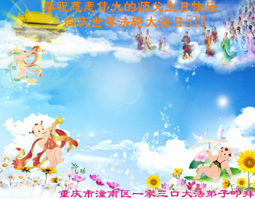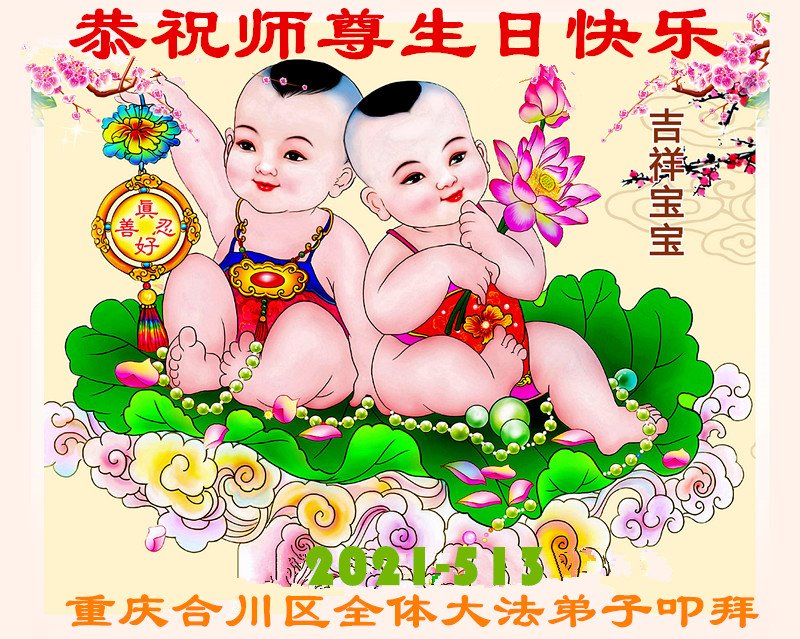 值二零二一年师尊华诞暨法轮大法日22年之际,重庆市涪陵区一大法弟子恭祝师尊生日快乐!暨世界法轮大法日! 2021年5月3日 重庆市潼南区一家三位大法弟子恭祝慈悲伟大的师父生日快乐!