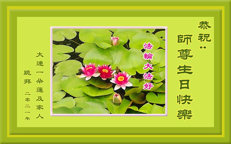 辽宁省大连市一朵莲及家人恭祝慈悲伟大的师尊生日快乐!贺法轮大法洪传二十九周年暨世界法轮大法日!
