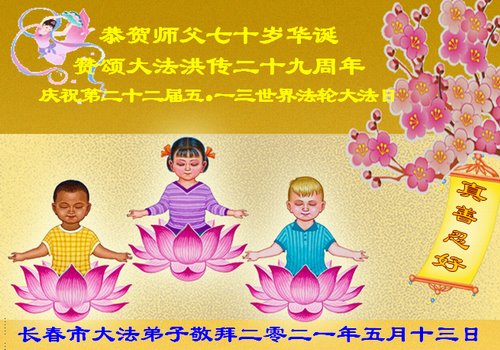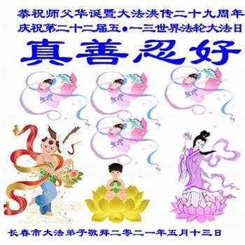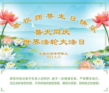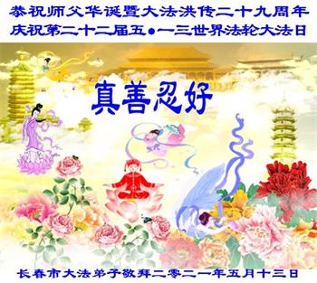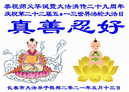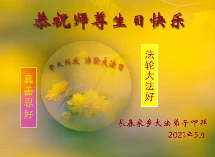 恭祝师父华诞暨大法洪传二十九周年! 庆祝第二十二届五·一三世界法轮大法日! 真善忍好! 长春市大法弟子敬拜 二零二一年五月三日 吉林省长春市大法弟子恭祝师父生日快乐!