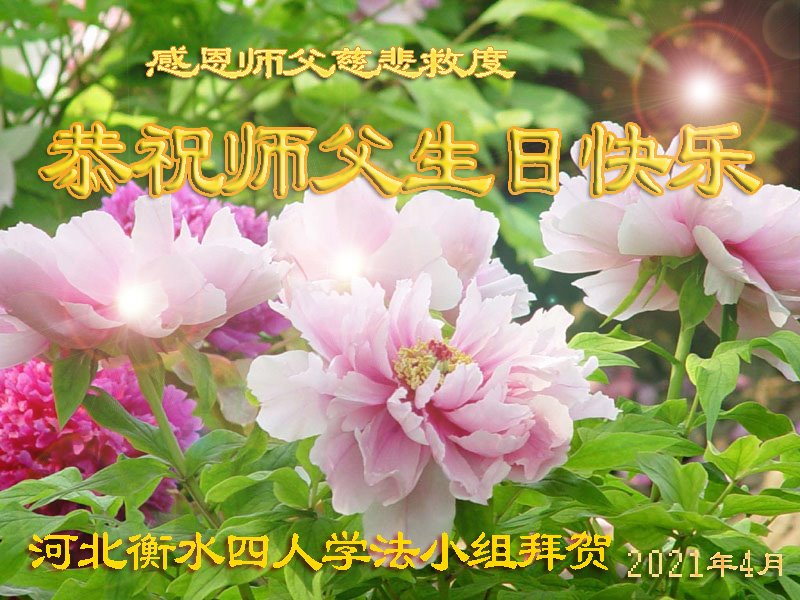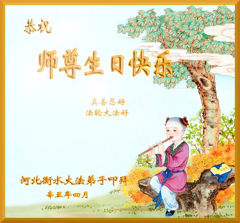 师尊辛苦了!感恩师尊慈悲救度! 我们定会珍惜师尊恩赐的修炼机缘,真修实修,时时对照法向内找,修好自己,不辜负师尊的慈悲,不负众生的期盼。圆满随师还。普天同庆世界法轮大法日。 河北衡水四位大法弟子恭祝师尊生日快乐!