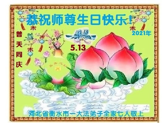 河北省衡水市大法弟子全家七人恭祝慈悲伟大的师尊生日快乐!