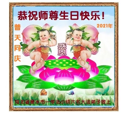 在二零二一年法轮大法日来临之际,用诚心敬意恭贺法轮大法日。珍惜师尊用巨大付出延续来的时间,分秒必争、精進实修、做好三件事。让师尊放心。 河北大法弟子两个家庭全体人员恭祝师尊生日快乐!