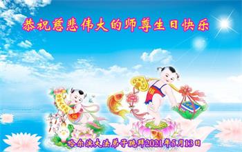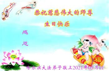 恭贺世界法轮大法日! 回忆二十余年修炼历程,一路走来,感谢师父的慈悲救度。回想起来,我泪流瞒面,在今后修炼的路上比学比修精進不停。 2021年5月8日 黑龙江省哈尔滨市平房区一大法弟子恭祝师尊生日快乐!