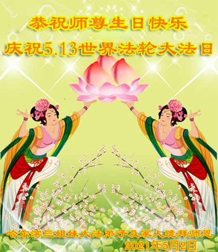 【明慧网二零二一年五月十一日】 黑龙江省哈尔滨市三姐妹大法弟子及家人恭祝师尊生日快乐!庆祝世界法轮大法日!