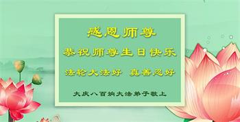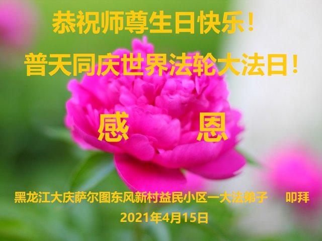 感恩师尊度 不负下世愿 众生闻法笑 圆满随师还 黑龙江省大庆市东风新村某小区全体大法弟子恭祝师尊生日快乐!
