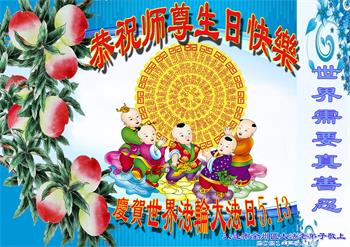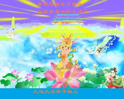 恭贺世界法轮大法日! 恭贺法轮大法洪传二十九周年! 恭祝师尊生日快乐! 慈悲伟大的师尊您辛苦了,师尊为弟子操劳二十多年,弟子还没有达到师尊所要的标准,弟子今后一定要做到,努力做好三件事,修去人心。圆满随师还! 大连周边大法弟子 辽宁省大连市金州区一老年大法弟子恭祝师尊生日快乐!