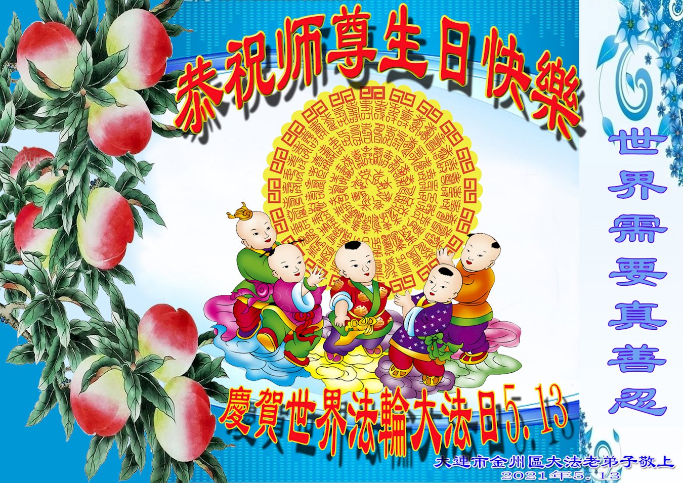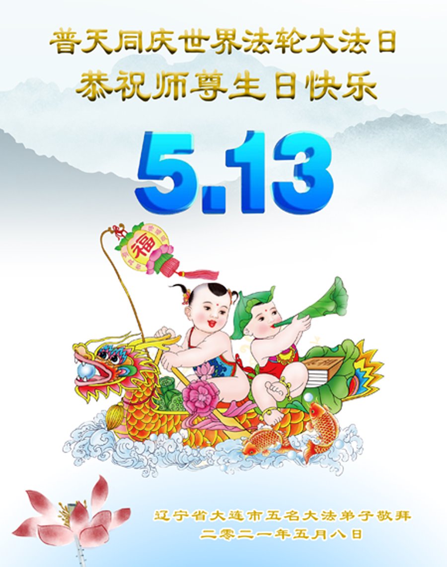 普天同贺5.13世界法轮大法日! 在这普天同庆的日子里,祝贺师尊生日快乐! 弟子不知用什么语言来表达对师尊救度之恩的感激之心,师尊给予了弟子太多太多,师尊对弟子的珍惜,弟子无以回报,只有听师尊的话,做好三件事,多救人,让师尊少操心,愿师尊天天高兴,唯有精進再精進! 弟子感恩师尊,叩谢师尊的慈悲苦度! 辽宁省大连市五名大法弟子合十 2021年5月8日 辽宁省大连瓦房店市大法弟子恭祝师尊华诞!