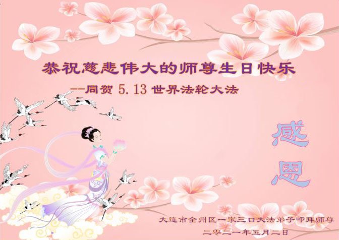 辽宁省大连一家三位大法弟子恭祝师尊生日快乐!恭贺世界法轮大法日!