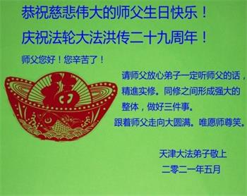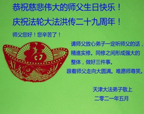 恭祝慈悲伟大的师父生日快乐!庆祝法轮大法洪传二十九周年! 师父您好!您辛苦了! 请师父放心弟子一定听师父的话,精進实修,做好三件事。同修之间形成强大的整体,跟着师父走向大圆满。唯愿师尊笑! 天津大法弟子敬上 二零二一年五月八日 天津市北辰区大法弟子恭祝慈悲伟大的师尊生日快乐!庆祝五一三法轮大法日