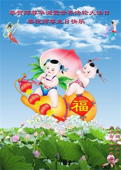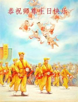 恭祝慈悲伟大的师尊生日快乐!恭贺世界法轮大法日! 师乘金龙降祥瑞 万般佛光寰宇辉 恩泽苍生渡大劫 普天同庆颂佛恩 下世喜作佛弟子 洗净污垢返本真 风雨无阻救世人 他日归位回天廷 天津中老年大法弟子恭贺法轮大法日!