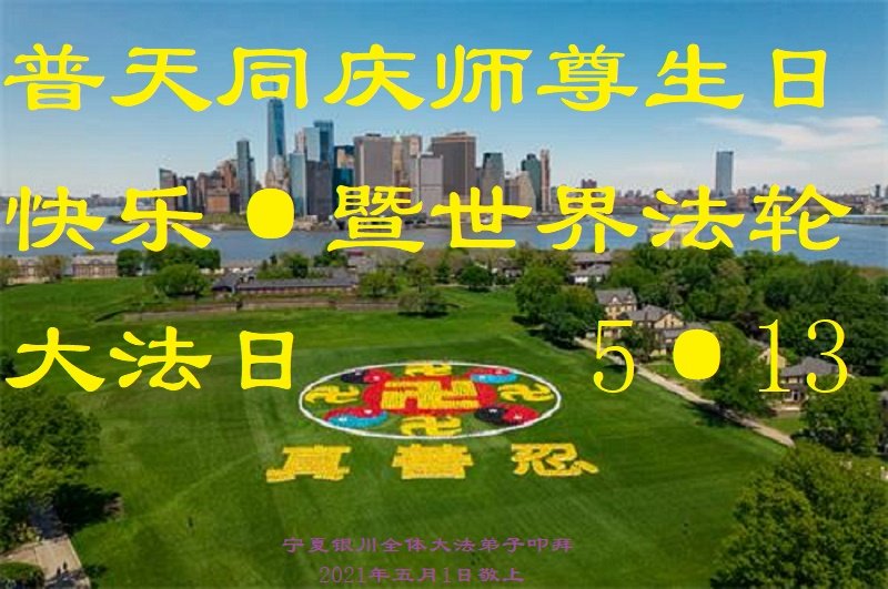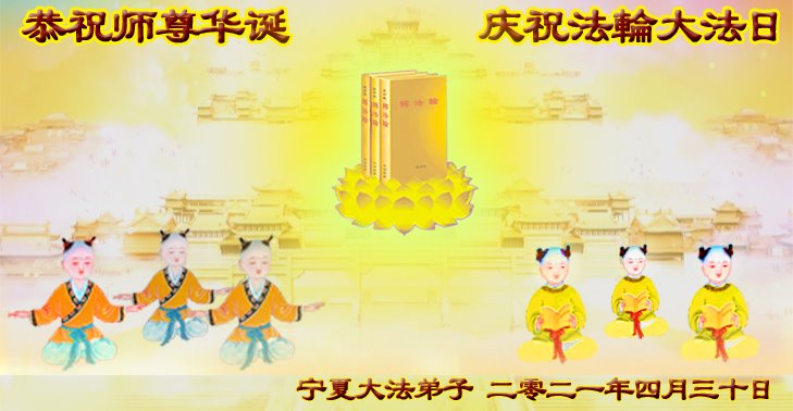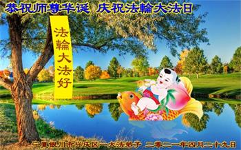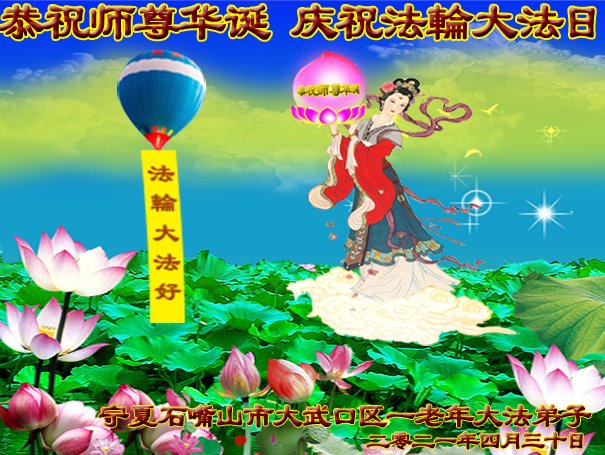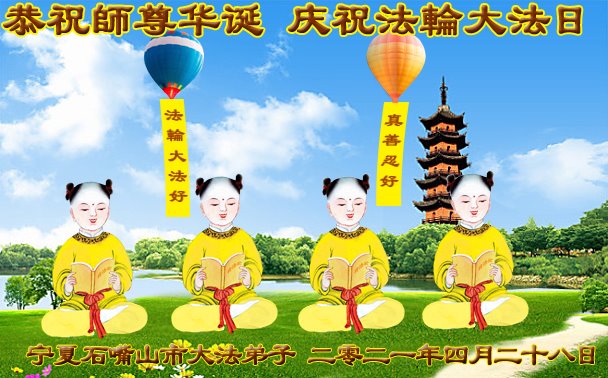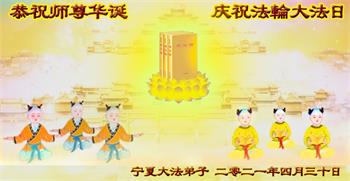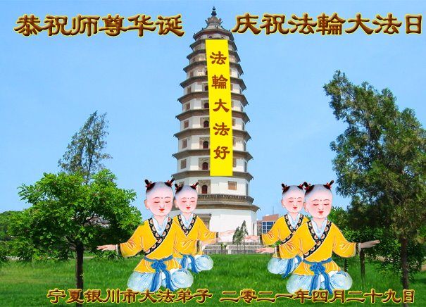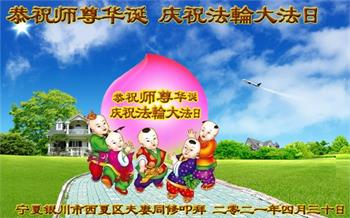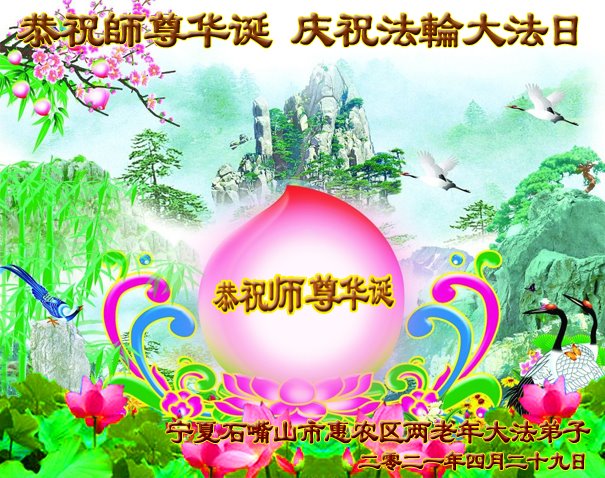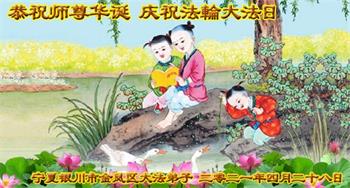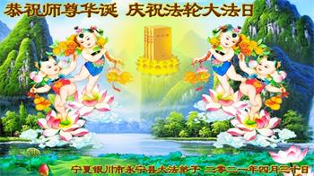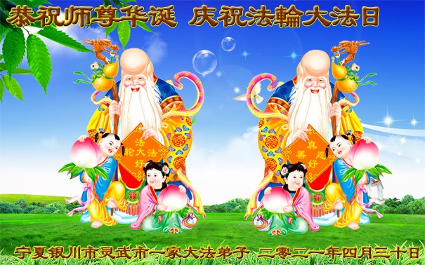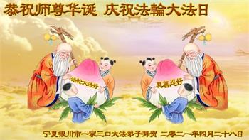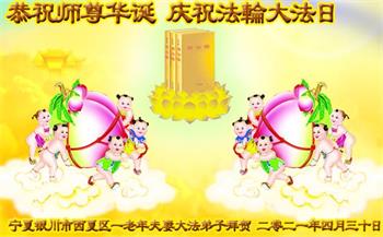 师尊逢华诞宇宙恭贺, 法轮大法日普天同贺, 法轮大法好响彻九霄, 佛光照乾坤众生快乐! 师尊逢华诞宇宙恭贺, 法轮大法好苍宇同歌, 危难时诚念九字真言, 逢凶能化吉佛光润泽。 宁夏银川市大法弟子恭祝师尊生日快乐!暨世界法轮大法日!