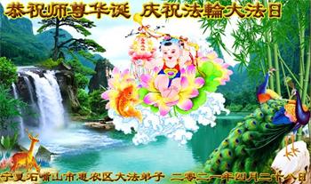 八方齐恭祝师尊生日, 四海庆祝法轮大法日, 众生高歌法轮大法好, 佛光普照福泽众生喜。 宁夏大法弟子恭祝师尊七十华诞!庆祝世界法轮大法日!