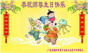 感谢师父慈悲救度!弟子一定好好修,让师父少一份操劳,多一份欣慰。 广东省揭阳市普宁学法小组全体大法弟子恭祝慈悲伟大师尊生日快乐!