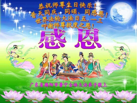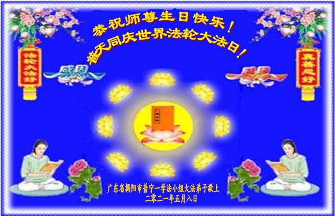 在五·一三世界法轮大法日到来之际,弟子们衷心感谢伟大师父的慈悲救度!叩拜师父的再造之恩!普天同庆法轮大法洪传世界!弟子们一定要更加精進,实修自己,同化大法,救度众生,报答师恩。 广东省揭阳市普宁全体大法弟子恭祝慈悲伟大师尊生日快乐!