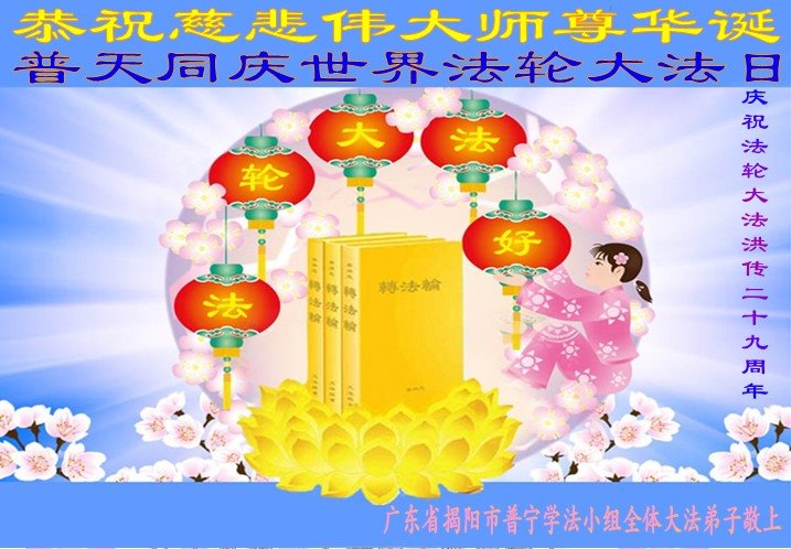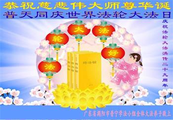 庆祝法轮大法洪传二十九周年! 广东省揭阳市普宁全体大法弟子恭祝慈悲伟大师尊华诞暨世界法轮大法日!