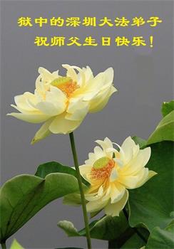 弟子感恩师父慈悲救度!师尊您辛苦了!您为弟子与众生操尽了心!弟子一定牢记师尊的教诲,修好自己,多学法,学好法,做好三件事,完成使命,兑现誓约,不辜负师尊的慈悲救度! 狱中的两位广东省深圳女大法弟子祝师父生日快乐!