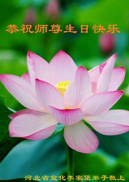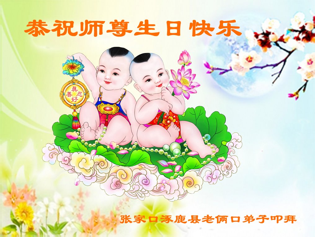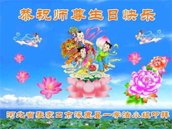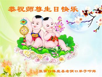 在世界法轮大法日和慈悲伟大的恩师生日到来之际,张家口市区一大法弟子全家恭祝师尊华诞!恭祝慈悲伟大的师父生日快乐!祝贺世界法轮大法日! 自中共迫害法轮功以来,我们全家遭受了中共恶魔的残酷迫害,孩子的妈妈已被迫害离世,但是我们全家六口对大法坚定的信念没有变,对师父的敬仰和感恩没有变。在世界法轮大法日和慈悲伟大的恩师生日到来之际,全家再次表达对慈悲伟大的恩师的感恩与救度,谢谢师父! 谢师尊 早在二十六年前 有幸与法结圣缘 感恩师父慈悲护 越过重重关与难 风霜雪雨二十载 迫害惨烈志愈坚 纵有千难与万险 坚修大法心不变 值此法轮大法日 弟子恭祝师华诞 精進精進再精進 功成圆满随师还 河北省张家口市涿鹿县老年学法小组大法弟子恭祝师尊生日快乐!