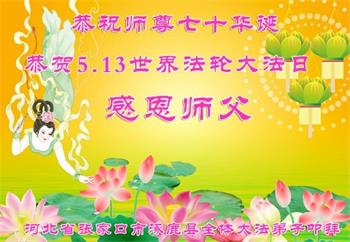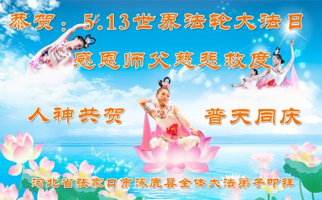 普天同庆,恭祝5月13日世界法轮大法日。 师尊辛苦了,祝师尊生日快乐! 河北张家口市涿鹿县全体大法弟子恭祝师尊七十华诞!恭贺法轮大法日!