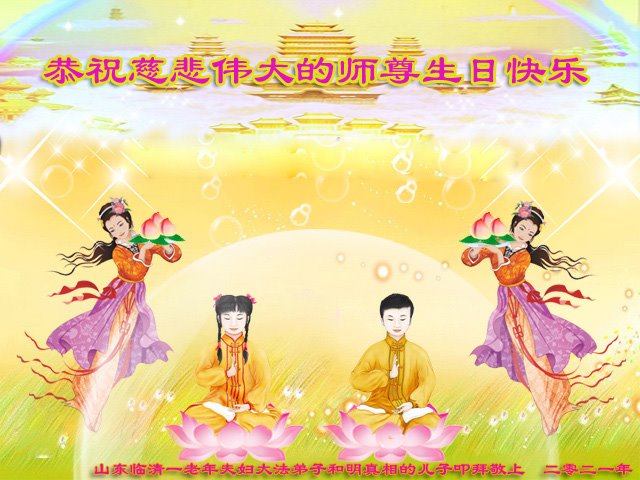 师父好!师父辛苦了!谢谢师父慈悲救度!法轮大法好!真善忍好! 山东省聊城市临清市一老年夫妇大法弟子和明真相的儿子恭祝慈悲伟大的师尊生日快乐!恭贺世界法轮大法日!
