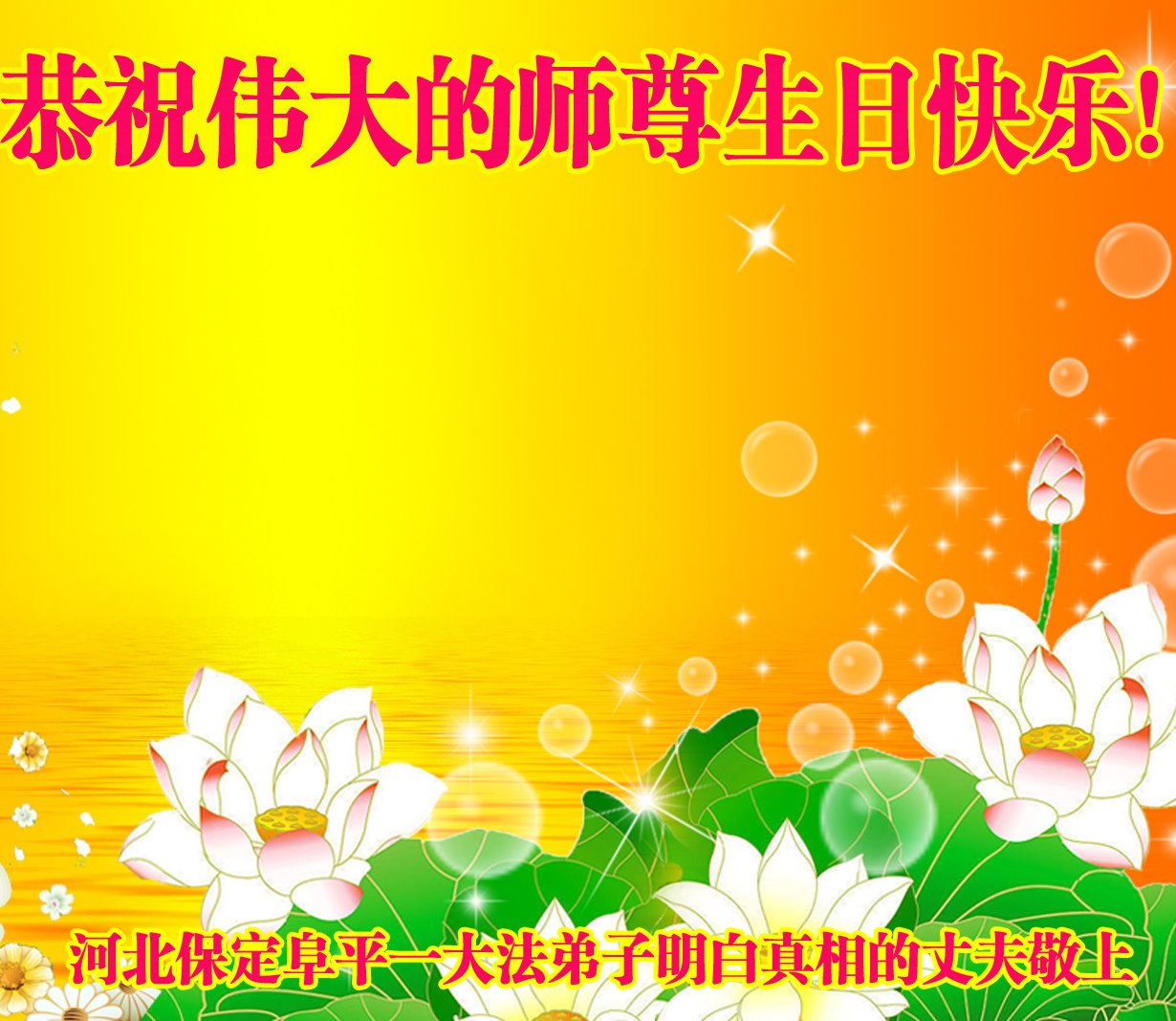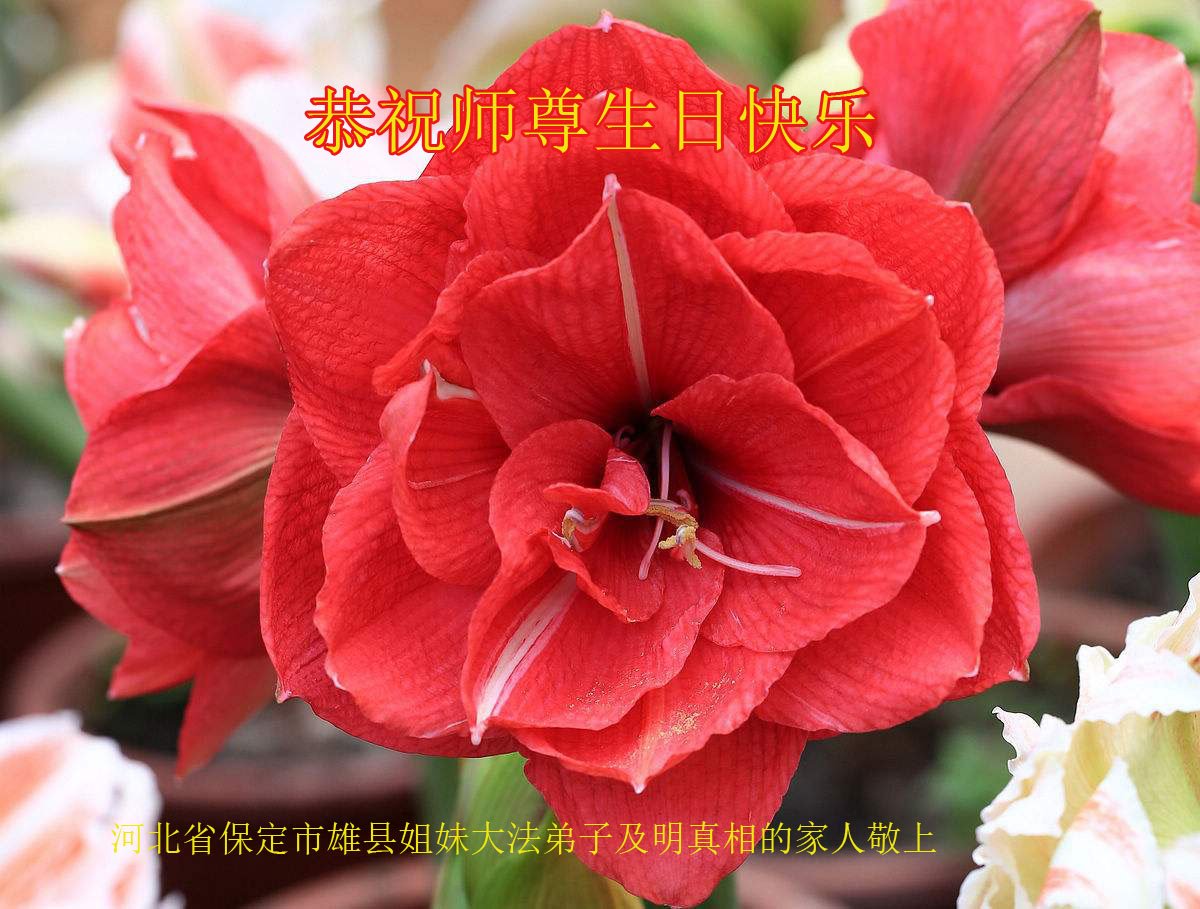 伟大的师尊您好!在普天同庆、恭贺5.13世界法轮大法日的隆重喜庆日子里,我们恭祝伟大师尊华诞!法轮大法洪传于世,救度着无数众生,有幸喜得宇宙大法的弟子们见证着法轮大法所赐予的美好。不仅弟子们受益无穷、身体健康,还使亲朋好友、同事、有缘世人化险避灾、受益良多。大法使弟子们的道德品质和修炼不断提升,大法还从根本上攺变着当今社会败坏了的人心和世风日下的道德,使明白真相的众生从根本上能被大法救度。弟子们及众生从内心深处感恩师尊与法轮大法。隆重庆贺世界法轮大法,那是弟子们及众生的心愿。弟子们及众生用尽人世间最美妙、最壮丽的词汇也表达不尽对师尊的无限感恩!二十多年来在师尊的保护下,弟子们走过了修炼、正法与救度众生的最神圣的路,大法成就着弟子们未来美好的一切。有幸、有机缘兑现着弟子们神圣的使命,弟子感恩师尊的恩赐予安排,叩拜恩师!感谢恩师!无论任何时候、任何压力下都无法阻挡弟子们修心向善、坚定助师正法的步伐。请师尊放心! 全体大法弟子及新学员敬拜师尊! 河北省保定市雄县姐妹大法弟子及明真相的家人恭祝师尊生日快乐!
