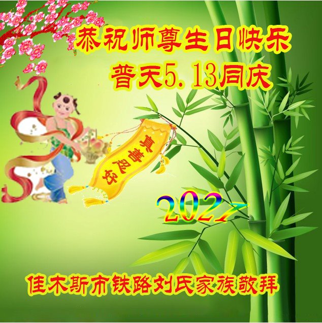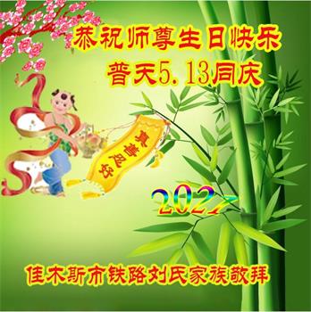 普天同庆5·13!恭祝师尊生日快乐!师尊您辛苦了!正法進程,突飞猛進,弟子在学法中不断升华,感恩师尊的慈悲保护,弟子在不多的时间里,扎扎实实、脚踏实地的修好自己,用真心报答师尊的救度之恩。 二零二一年四月二十日 四川攀枝花市一大法弟子的侄儿、侄媳全家四口恭贺李大师华诞暨世界法轮大法日!