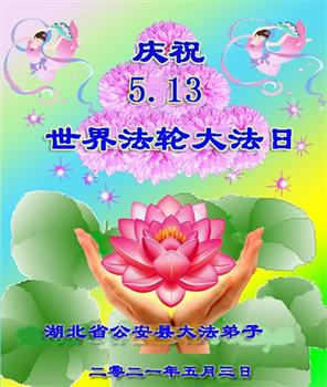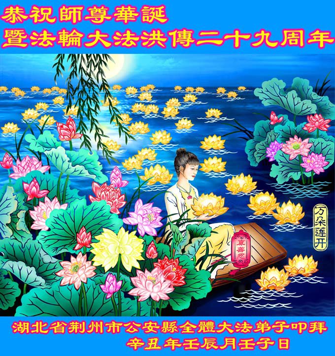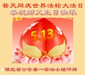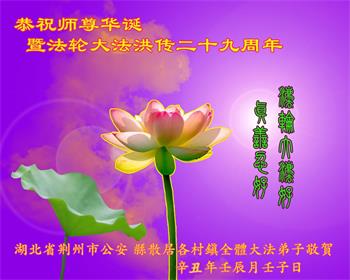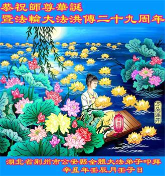 法轮大法光辉照耀寰宇亘古永恒 慈悲师尊恩德普泽天地众生觉醒 在五·一三普天同庆之际,全体大法弟子恭祝师尊华诞暨法轮大法洪二十九周年!师尊辛苦了! 感恩师尊为众弟子及天地苍生操劳! 弟子们大礼叩拜师尊 湖北省荆州市公安县散居各村镇全体大法弟子恭祝师尊华诞暨法轮大法洪传二十九周年!