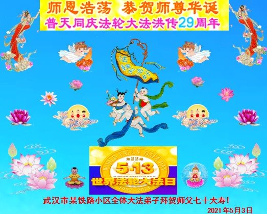 湖北省武汉某铁路小区全体大法弟子拜贺师父七十大寿!普天同庆法轮大法洪传29周年!