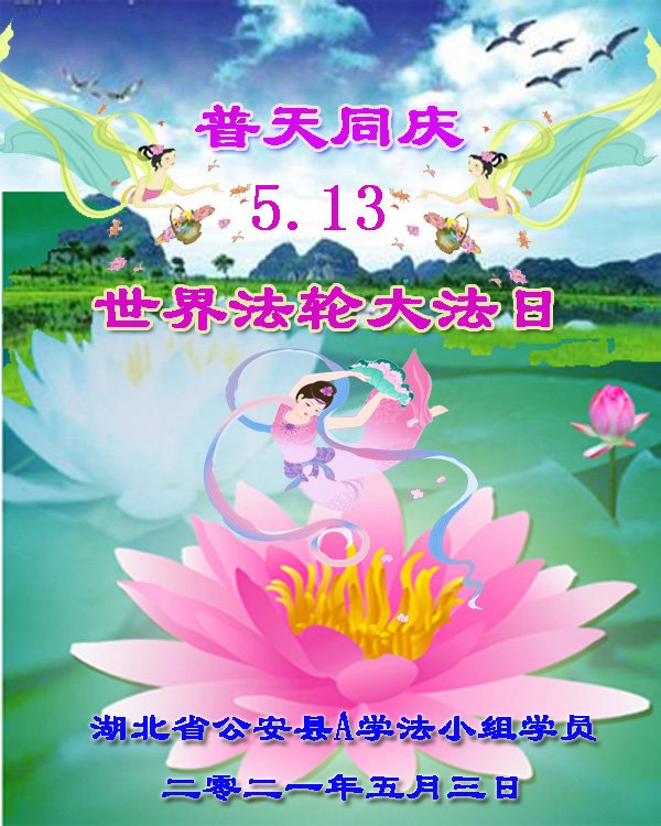 尊敬的师父您好!湖北省公安县A学法小组全体大法弟子怀着无比感恩激动的心情谢谢师父的慈悲救度之恩!在修炼这条路上,我们要百分之百的信师信法,坚定正念,解体邪恶。展现大法的美好,救度一切有缘世人,放下人心,以法为师,兑现誓约,不辜负师父对弟子的期望。师父啊,您放心,再大的魔难也阻挡不了我们一颗对大法坚定的心,精進实修,跟师父回家。 湖北省荆州市公安县大法弟子庆祝5.13世界法轮大法日!