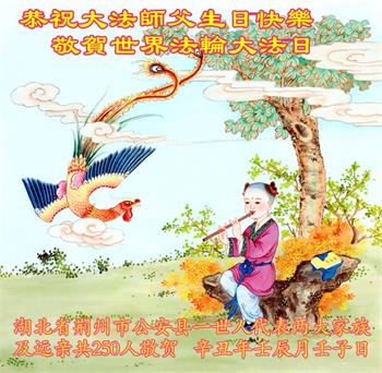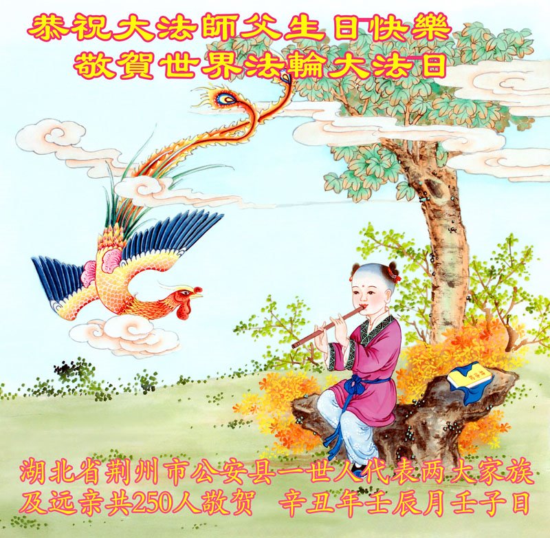 代表两大家族及远亲,遥祝大法师父福如东海永长流!寿比南山永长青!天地苍生同庆5.13世界法轮大法日!感谢师父在大灾大难中保佑我所有亲人。 合十 湖北省荆州市公安县大法弟子亲人代表两大家族恭祝师父生日快乐!