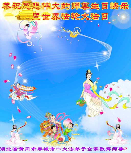 恭祝师父生日快乐!敬贺5.13世界法轮大法日! 我们万幸有亲人修炼大法,教我们念诵“法轮大法好,真善忍好”九字真言,家族中亲人们多方受益,并得以躲过大灾难,我们当永生永世赞颂师父的无量恩德! 湖北省黄冈市麻城市一大法弟子全家恭祝慈悲伟大的师父生日快乐!恭贺世界法轮大法日!