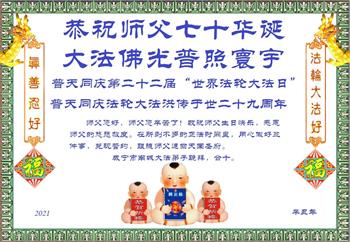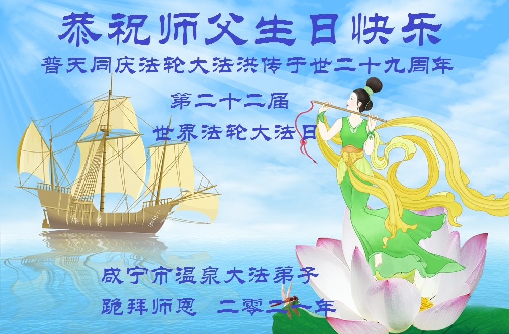 慈悲伟大师父的华诞到了,在这无比殊圣的伟大时刻,我们同时迎来了第二十二届“世界法轮大法日”。湖北省咸宁市南城地区大法弟子感恩师父的慈悲救度,师父您好,师父您辛苦了!敬祝师父生日快乐!感恩师父的慈悲救度。现在越来越多的世人明白大法真相,法轮大法的佛光已经普照寰宇。在所剩不多的正法时间里,弟子们会用心做好三件事,兑现誓约,跟随师父返回天国圣府。跪拜,合十。 湖北省武汉市武昌区一学法小组大法弟子恭祝师尊生日快乐!普天同庆世界法轮大法日!