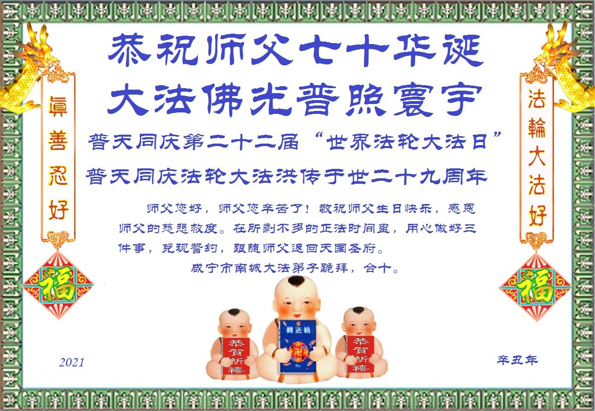 世界法轮大法日,我们无比喜悦,感恩师父的慈悲救度!不管环境多么险恶,我们都要正念正行,做好三件事,兑现誓约,圆满随师还! 湖北省咸宁市咸安区一老年大法弟子恭祝师父生日快乐!