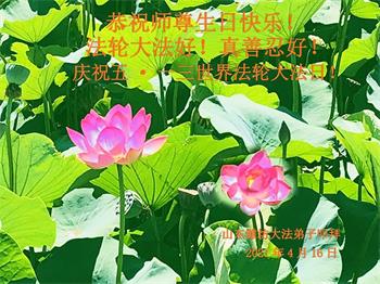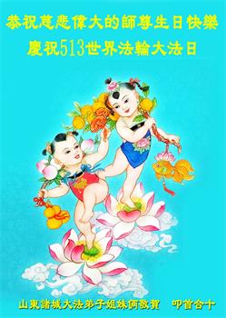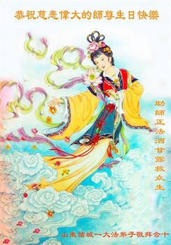 师尊您好!弟子配合讲真相、救人已经九年有余,不管严寒酷暑,甚至节假日也都是坚持半天在外救人,半天学法,配合非常默契。请师父放心,我们听师尊的教诲,做好三件事,多救人。 山东省潍坊市诸城市四人学法小组大法弟子恭祝师尊生日快乐!