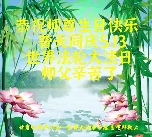 ! 庆祝五一三法轮大法日! 尊敬慈悲伟大的师尊好!师父您辛苦了!祝师父生日快乐! 弟子每时每刻都思念恩师,难以表达对师父的想念,望早日见到师父,在佛光普照下弟子不断的精進学好法,多学法,做好师父要求的三件事,多救人,完成史前大愿,跟师父回家。 甘肃兰州市城关区一大法弟子敬上 甘肃兰州市城关区大法弟子恭祝师父生日快乐!