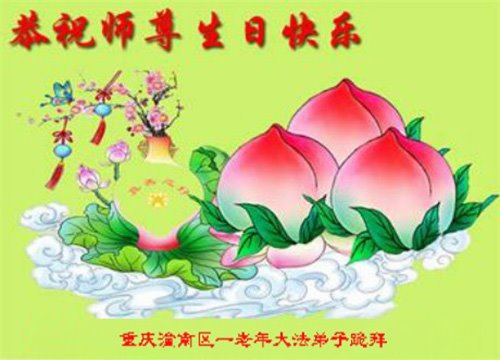 重庆市潼南区八十多岁的老年大法弟子恭祝慈悲的师尊生日快乐!